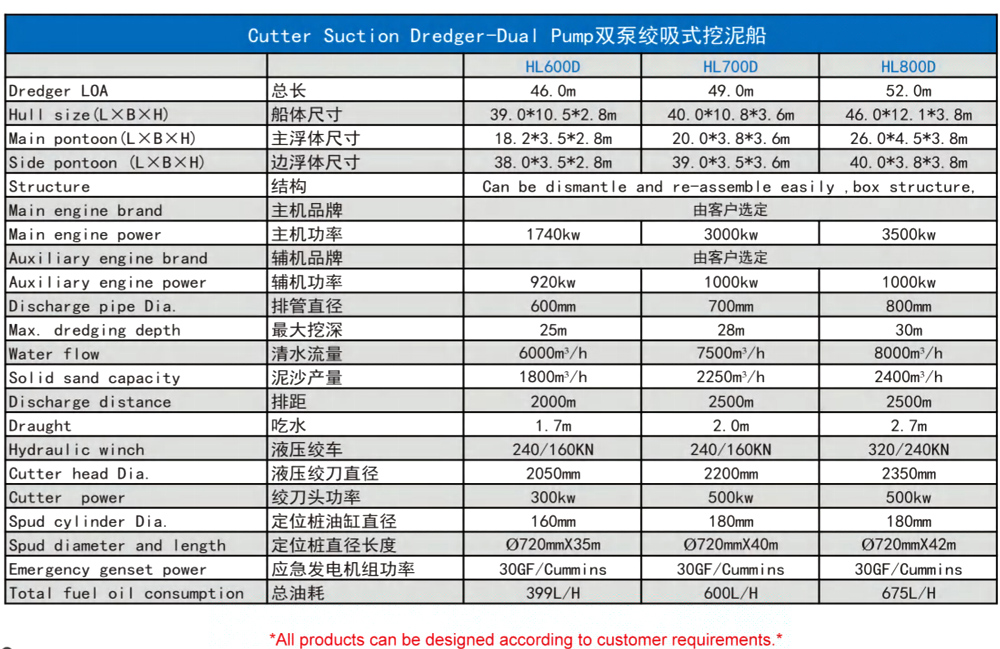 除了标准的绞吸式挖泥船,我们也生产客户定制的绞吸式挖泥船,它显著的特点是带有两个相同型号的挖泥泵,第 一 个泵安装在铰刀架上,第二个泵安装在中浮体上,通过变速箱和柴油机连接,泥水混合物通过吸管进入第 一 个泵,然后通过主管道进入第二个泵,最后通过第二个泵排出到漂浮管道。