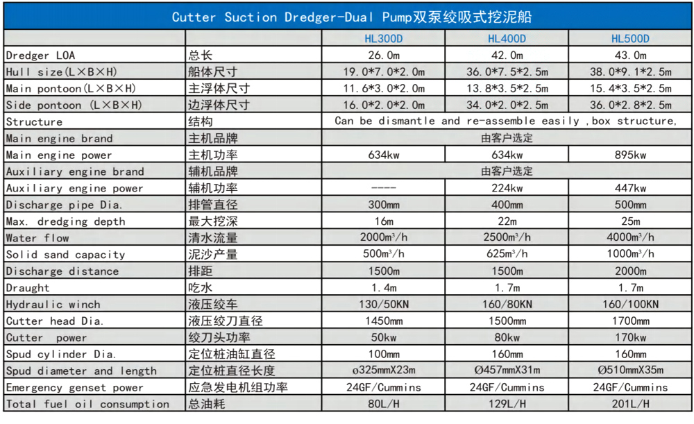 除了标准的绞吸式挖泥船,我们也生产客户定制的绞吸式挖泥船,它显著的特点是带有两个相同型号的挖泥泵,第 一 个泵安装在铰刀架上,第二个泵安装在中浮体上,通过变速箱和柴油机连接,泥水混合物通过吸管进入第 一 个泵,然后通过主管道进入第二个泵,最后通过第二个泵排出到漂浮管道。