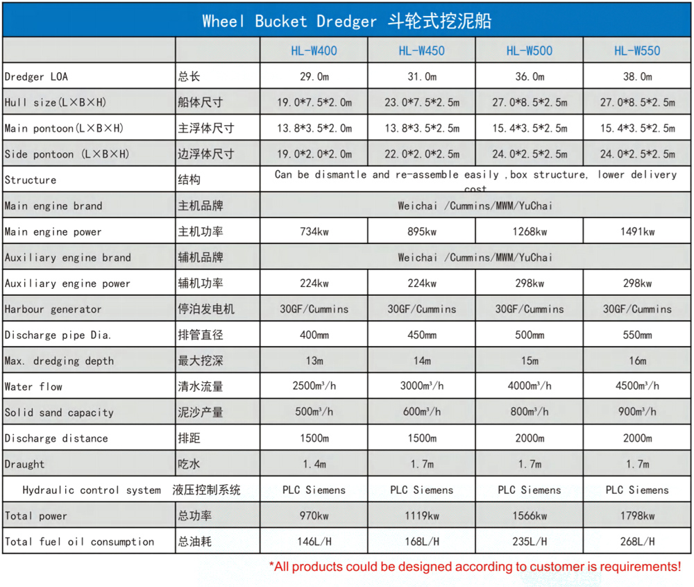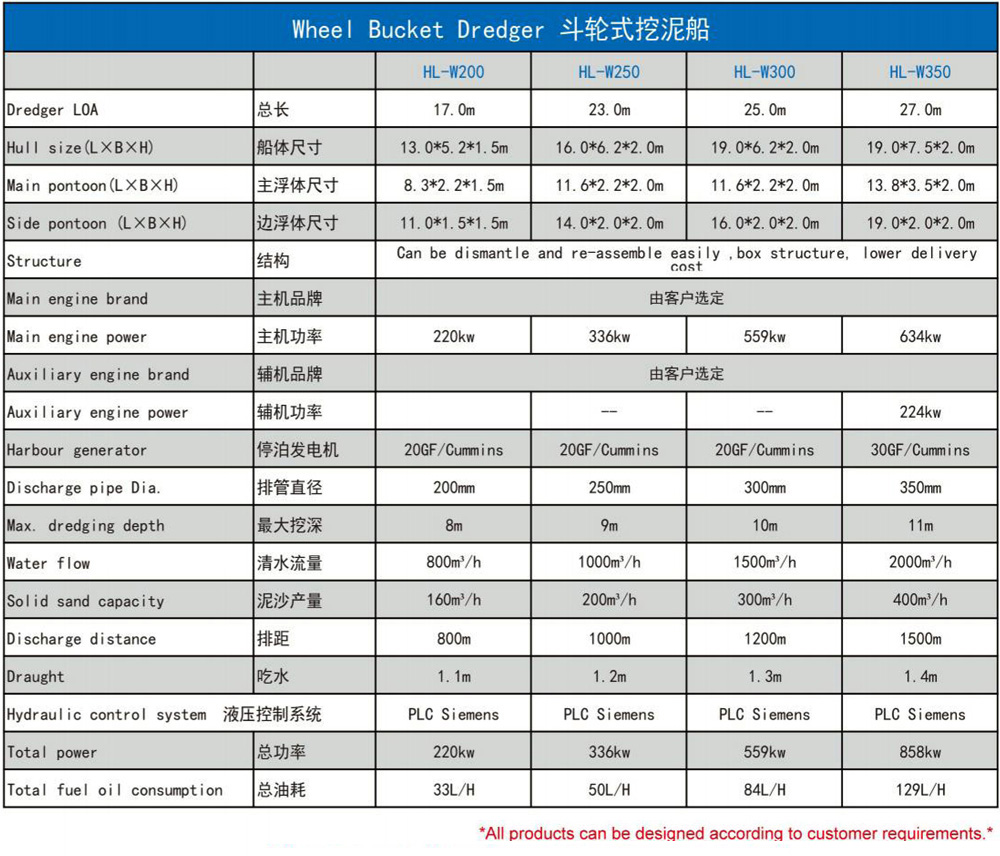 Wheel Bucket Dredger with full hydraulic control, dismantle and re-assemble easily ,suitable for inland waterwaydredging, ditches and reservoir dredging operations. Whole ship adopts hydraulic and centralized control system,consists of three pontoons. detachable type Cabin. equipped with anchor boom, trolley and other devices. Autolubrication device for cutter ensure long life, independent positioning metal floating ring seal.