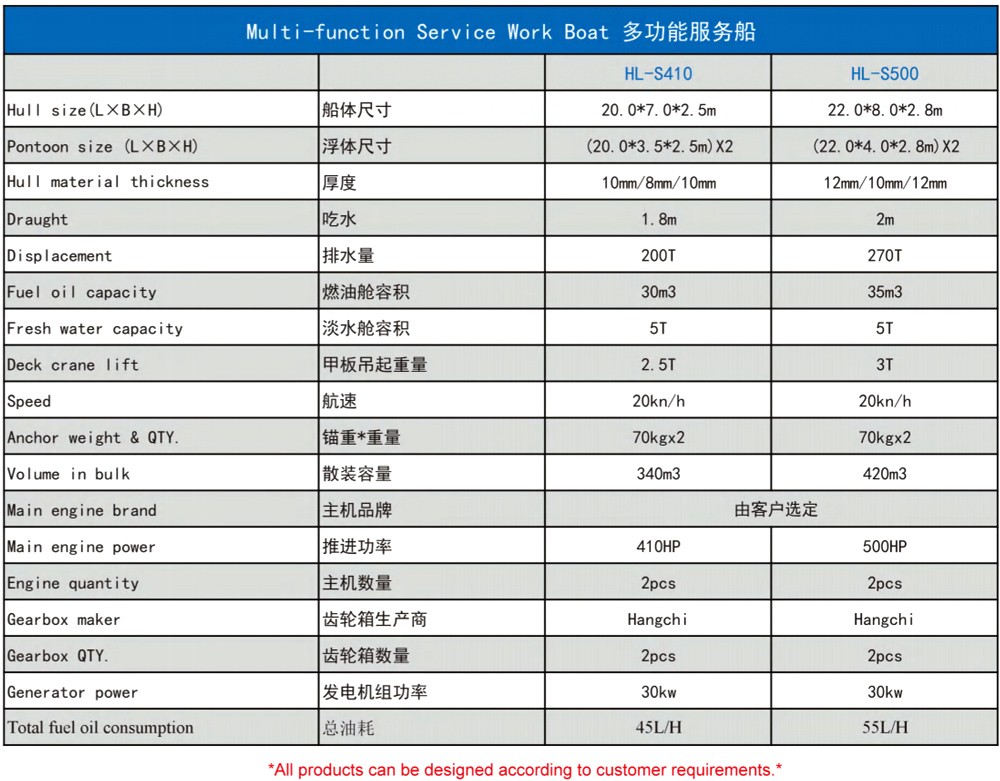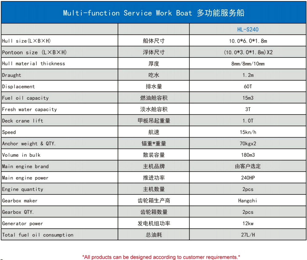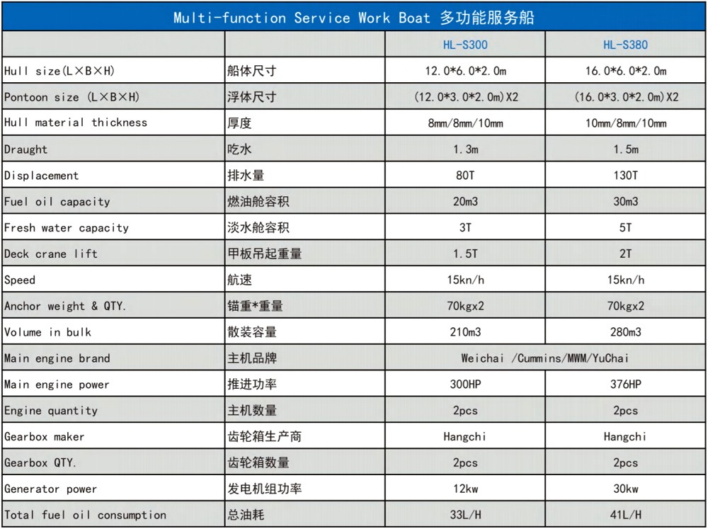 Multi-function Service Work Boat is used for cutter suction dredger in regular operation and maintenance, thestandard option including wheelhouse, deck crane and also can be customized. The new type work boat is widelyused for transporting dredging workers,diesel oil and hydraulic oil etc.