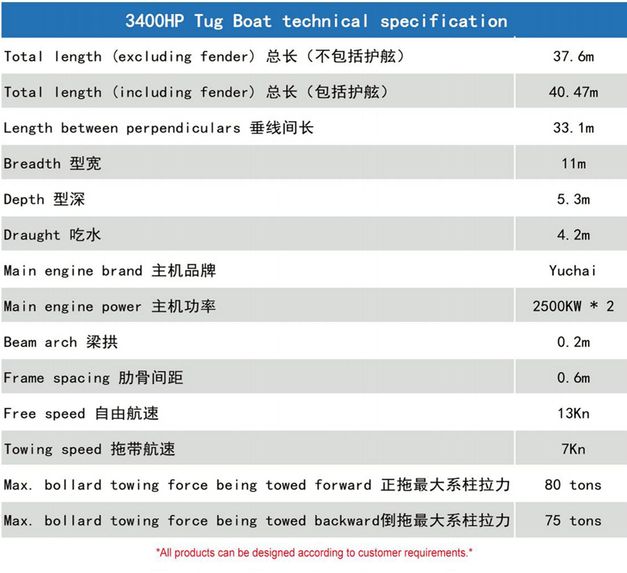 Our tug boats are mainly used for pushing, towing, assisting all kinds of large vessels to enter and leavethe port, berthing and leaving the dock, turning around etc. in the near navigation area (non ice area) andport waters, as well as to mobilize the berths, repairing ships in and out of dock, assisting trial sailing, etc..and the stability meets the reauirements in the near sea naviaation area. Our tug boats are characterizedby strong structure, good stability, high main engine power, large traction and good maneuverability.